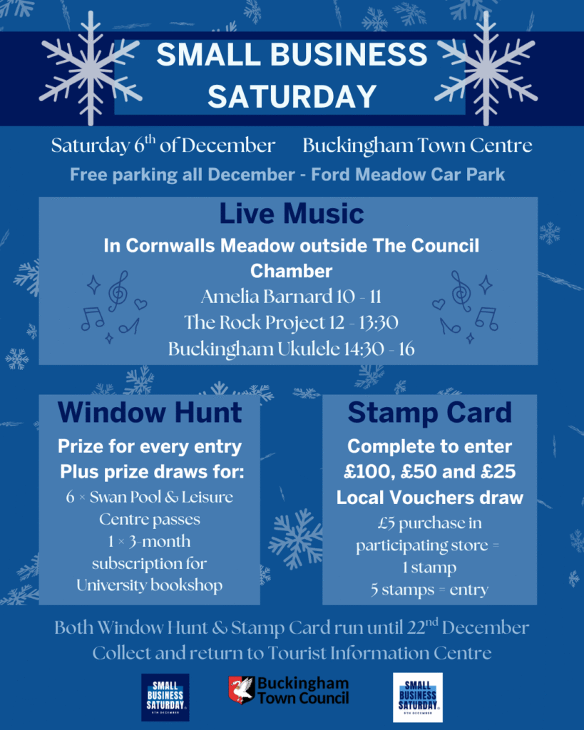 The second incentive is a loyalty card, designed to reward local spending. Each £5 spent at participating stores earns one stamp. Once your five stamps are collected, return your completed card to any participating business or the Tourist Information Centre to be entered into a £100, £50 and £25 Local Shopping Voucher prize draw. Participating businesses will be listed on the Buckingham Town Council website closer to the event.
